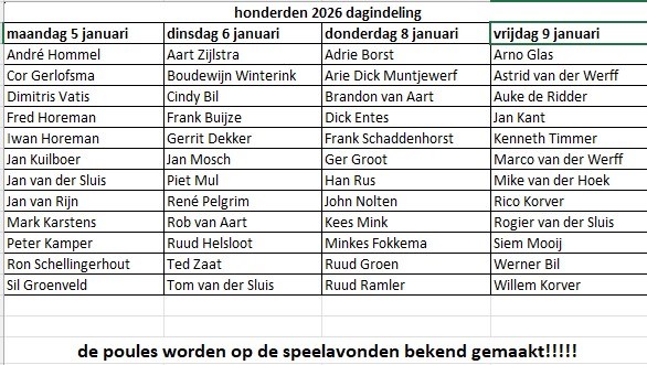 De toernooiorganisatie heeft de loting voor de dag-en poule-indeling verricht. In de bijlage vind je de dagindeling, om de spanning extra op te voeren wordt de poule-indeling op de speelavonden bekend gemaakt.