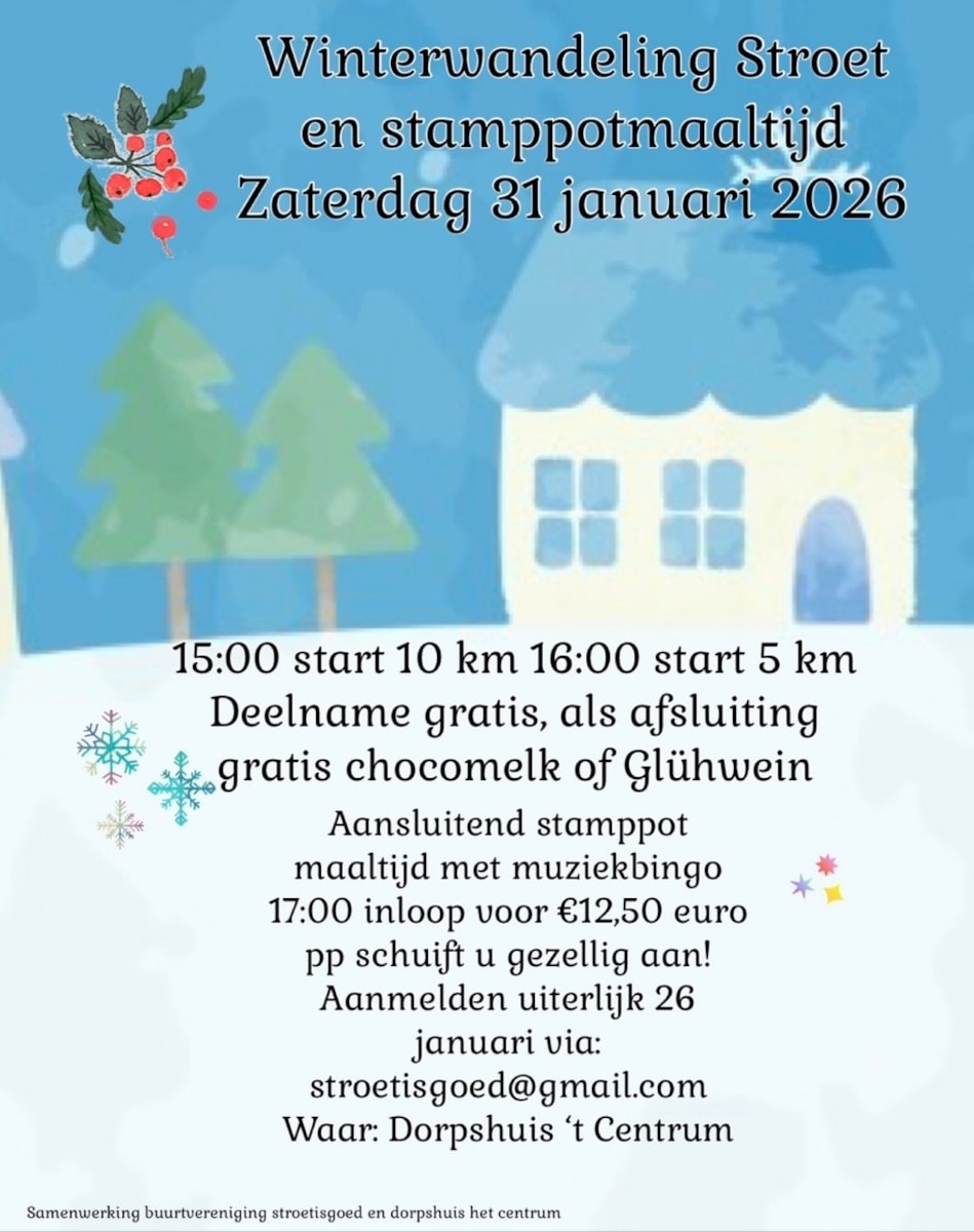 Op 31 januari wordt op Stroet de jaarlijkse winterwandeling georganiseerd. Aansluitend gratis glühwein of choco. Vervolgens vindt de stamppotmaaltijd plaats met muziekbingo. Voor €12,50 pp. Schuift u aan tijdens de maaltijd. Deelname aan de wandeling is gratis.