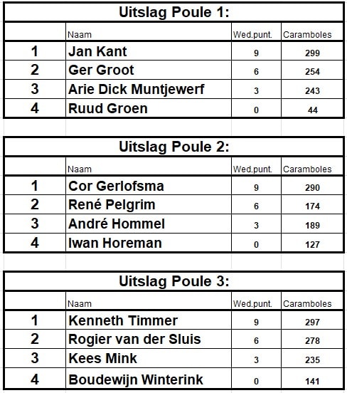 Nadat de 12 deelnemers verdeeld over drie poules tegen elkaar hadden gespeeld kwamen Jan Kant, Cor Gerlofsma en Kenneth Timmer als poulewinnaars uit de vele spannende partijen.