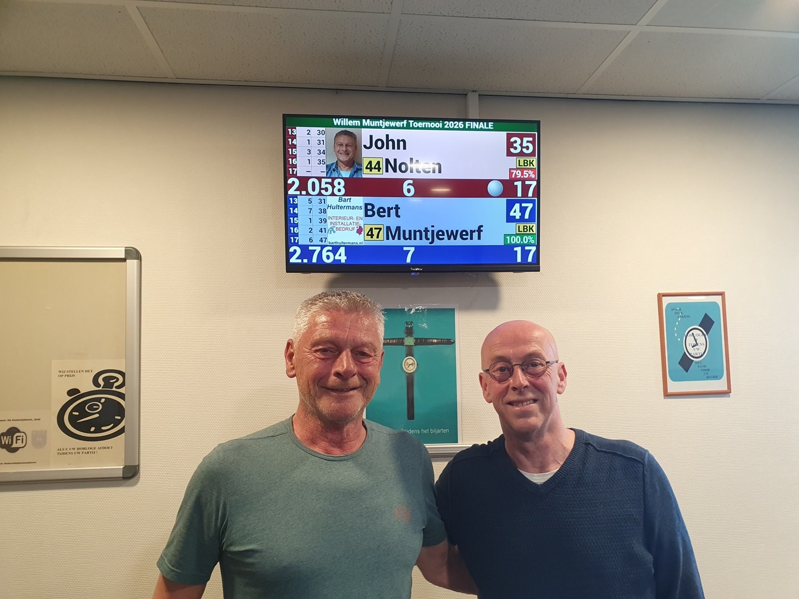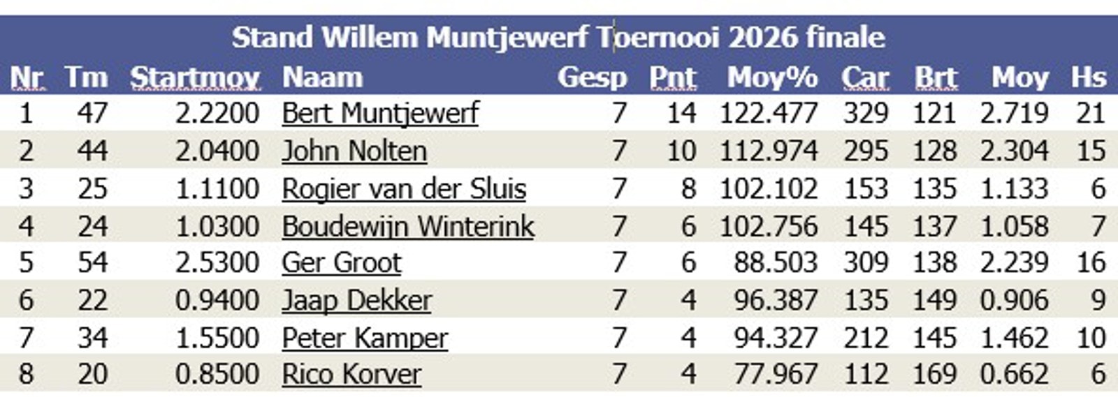 Geen van de finalisten is er in geslaagd punten af te snoepen van Bert Muntjewerf, daarmee gaat de titel 2026 mee naar Oudesluis. John Nolten eindigde als tweede en had in de finalepartij tegen Bert al bijna geen kans meer om het kampioenschap binnen te halen, daarvoor had hij in enkele beurten uit moeten zijn en had Bert geen caramboles moeten scoren, 2 matchpunten achter en een lager moyenne percentage zijn in 1 partij nauwelijks nog goed te maken. Rogier van der Sluis behield de derde plek in deze finale door zijn laatste partij tegen Rico Korver te winnen.