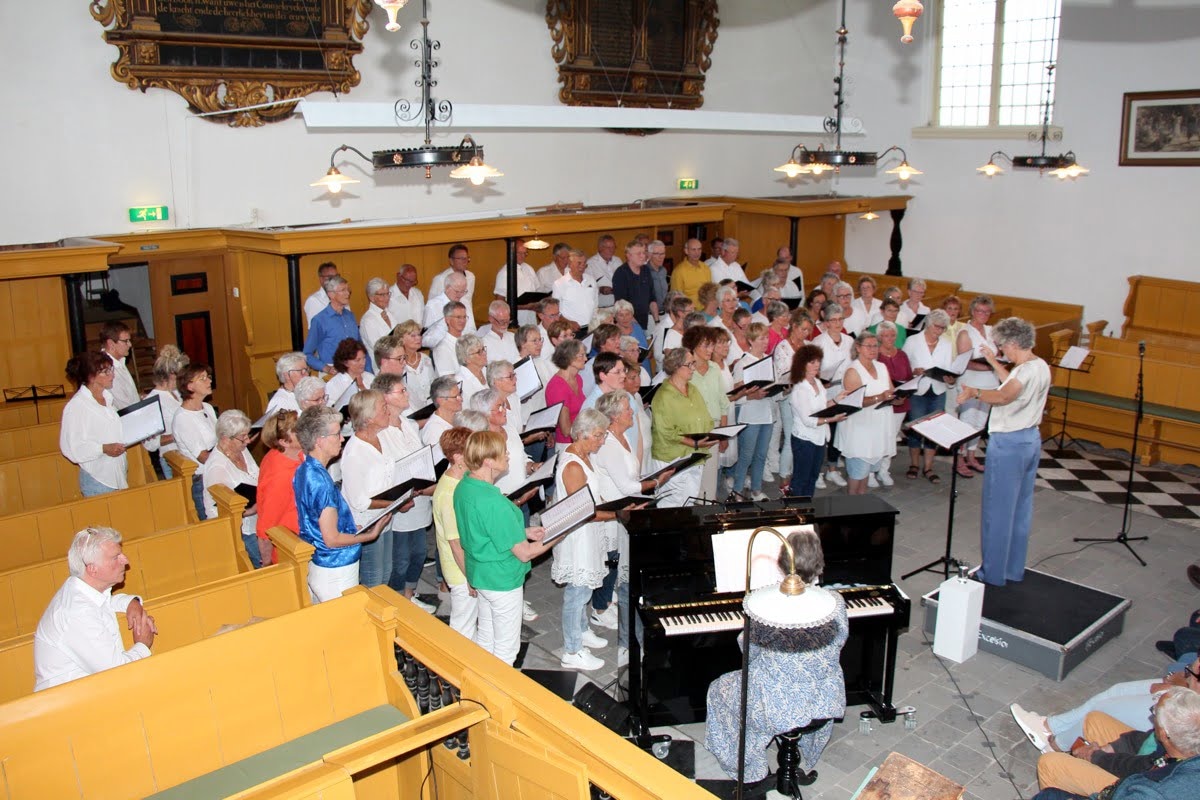 Net als in juli 2024 (zie de foto) geven we een zomerconcert met Koor sWing uit Heiloo, maar nu in de Witte Kerk van Heiloo. Onze dirigent Caroline Offerhaus is dirigent van beide koren.