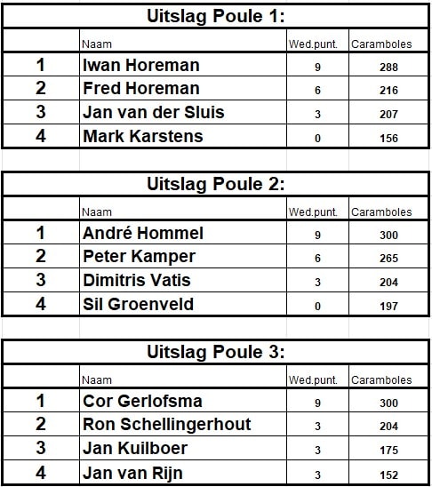 Gisteravond hebben 12 biljarters gestreden voor een plek in de finale van het Honderden Toernooi 2026 bij Krijt op Tijd. De drie poule winnaars komen zaterdagavond vanaf 19.00 uur in actie tegen de poulewinnaars van de plaatsingsronden op dinsdag- donderdag en vrijdagavond ook daar komen steeds…